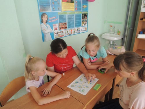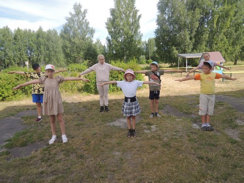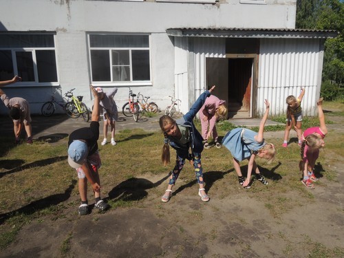 Утром воспитанники лагеря побывали на детской игровой площадке села. С удовольствием девочки покачались на качелях, а мальчики поиграли в футбол. Вожатые провели с ребятами игру «Акула».